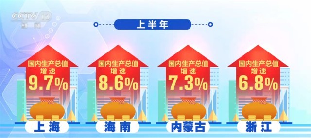 从上半年各省份的国内生产总值增速看,江苏、浙江等15个省份增速超过全国5.5%的增速,其中,上海、海南、内蒙古和浙江等省份增速均在6.8%以上,广东、江苏、山东等21个省份的国内生产总值增速超过了各自一季度的增速,经济增长恢复势头明显。