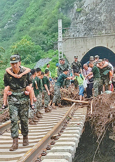 8月2日,武警北京总队机动某支队官兵护送落坡岭车站K396次列车受困群众。