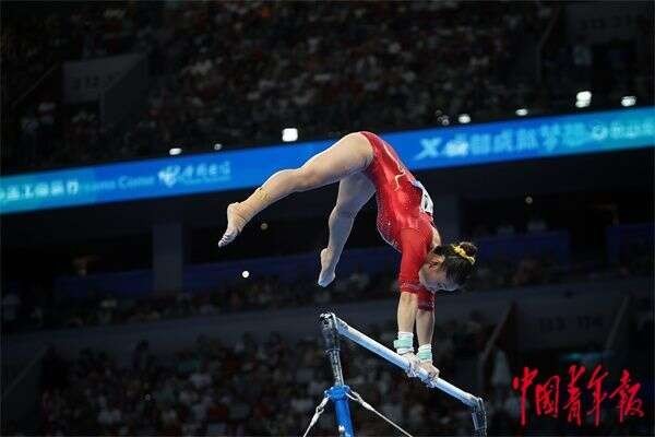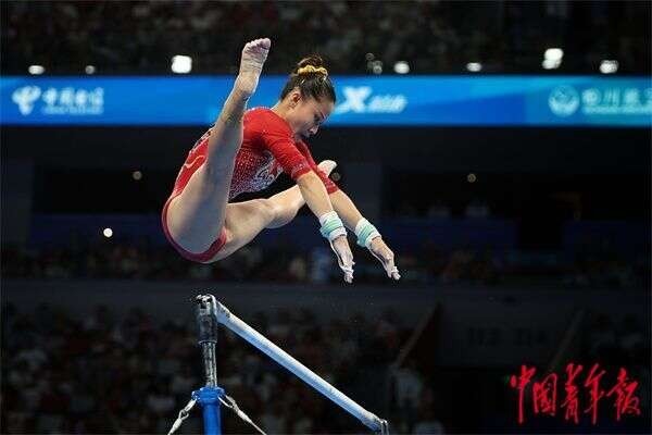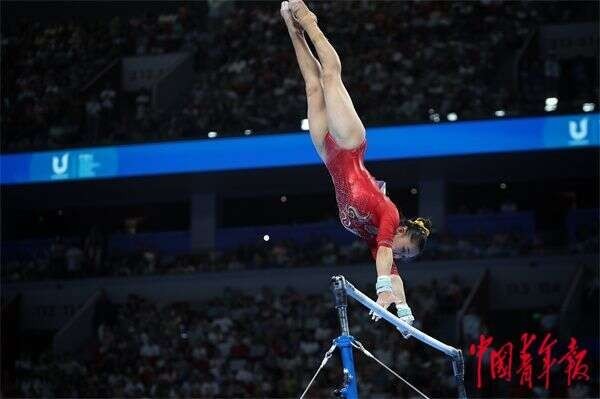 8月5日下午,来自北京师范大学的中国选手杜思雨以13.833分获得成都大运会体操女子高低杠冠军,德国选手索菲亚·赛琳娜获得银牌,另一名中国选手罗欢获得铜牌。(中青报·中青网记者慈鑫/文 赵迪/摄)