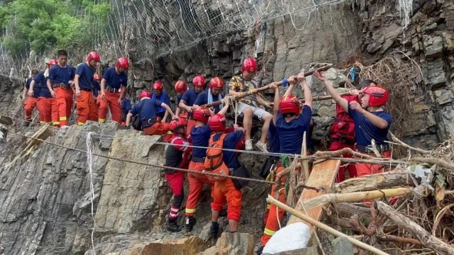 消防员冒着沿途多处出现塌方和滚石