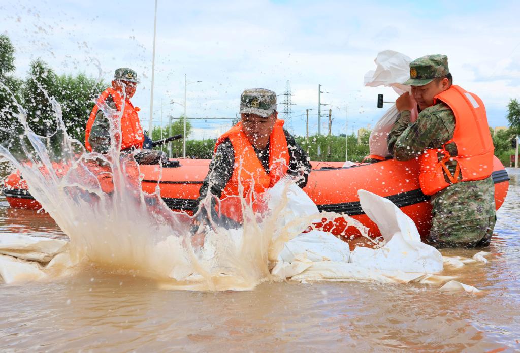 8月5日,黑龙江省哈尔滨市道外区人武部民兵应急分队在团结镇勤劳村展开救援。新华社发(吕衍海 摄)