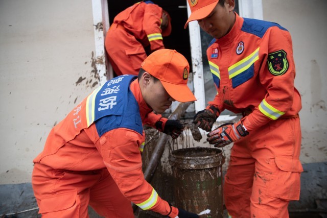 8月6日,在大海林林业局有限公司自来水供应站,消防救援人员在清理淤积。新华社记者张涛 摄