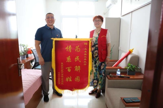 2023年6月,北京市门头沟区龙泉镇党委委员、副镇长刘捷接过东南街社区九号楼居民的锦旗。(北京市门头沟区政府/供图)