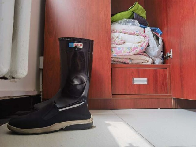 刘捷的办公室里,仍整齐摆放着雨鞋和布鞋。(中青报·中青网记者 尹希宁/摄)