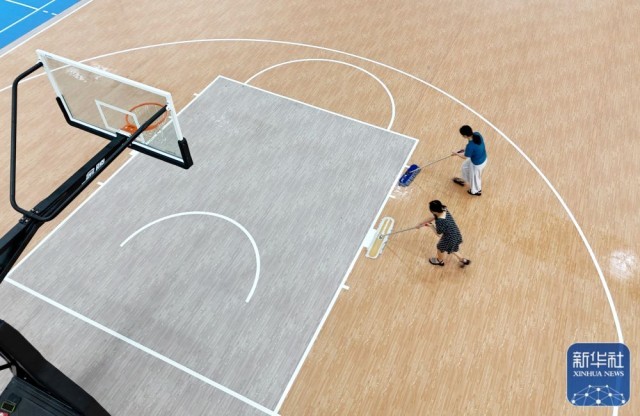 8月29日,浙江省乐清市晨曦路小学员工在清扫室内球场(无人机照片)。新华社发(蔡宽元摄)