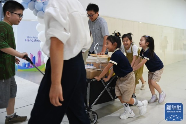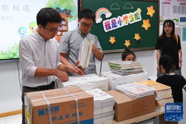 8月29日,杭州育才登云小学的老师与学生一同将教材运至教室,为开学做准备。新华社记者 黄宗治 摄