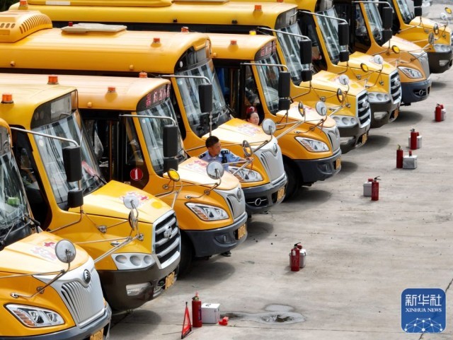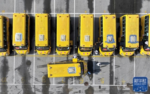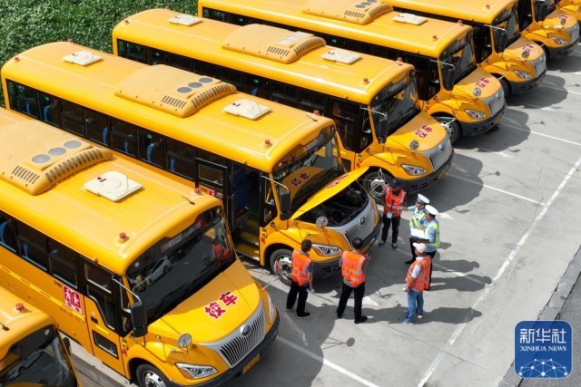 8月29日,江苏省淮安市洪泽区校车公司工作人员对校车进行安全检查(无人机照片)。新华社发(殷潮摄)