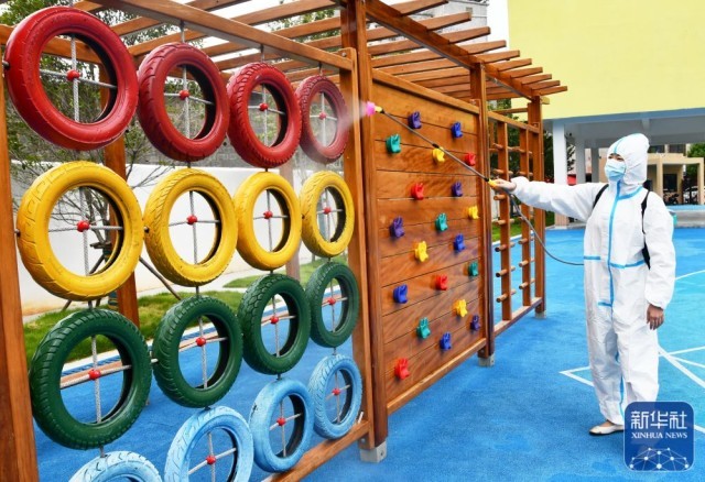 8月29日,在湖南省永州市江永县中心幼儿园,教工对活动器材进行清洁消毒。新华社发(田如瑞摄)