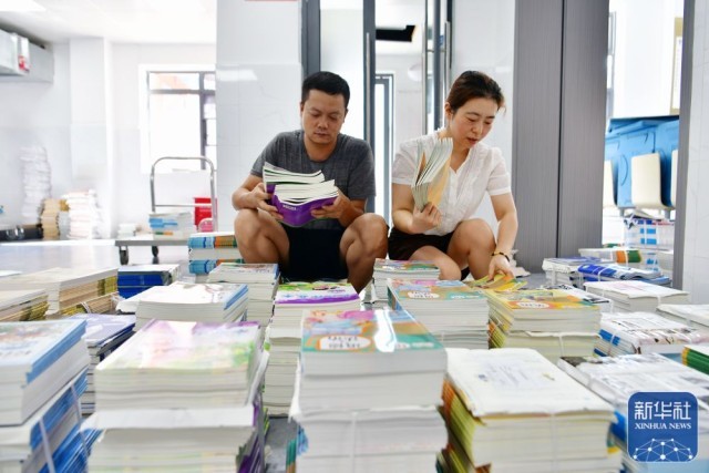 8月29日,湖北省宜昌市秭归县实验小学教师在清点新学期教材。新华社发(王辉富摄)