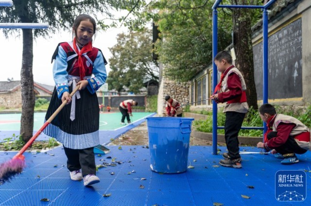 8月29日,云南省丽江市玉龙纳西族自治县玉湖完小学生在校园里打扫卫生。新华社记者 陈欣波 摄