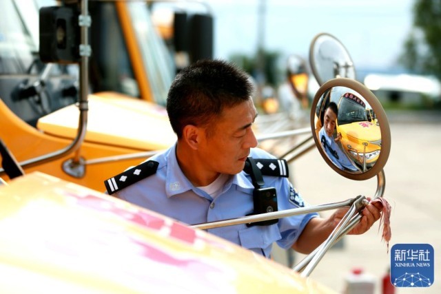 8月29日,江苏省扬州市公安局江都分局交警大队浦头中队民警检查校车倒车镜。新华社发(任飞摄)