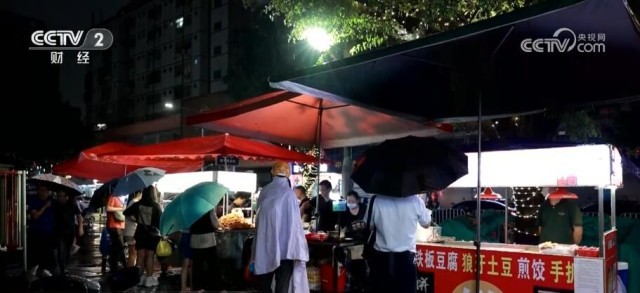 在广东深圳宝安区新安街道的一条美食街上,虽然正在下雨,记者看到不少摊主撑着伞棚在指定的区域里摆摊。