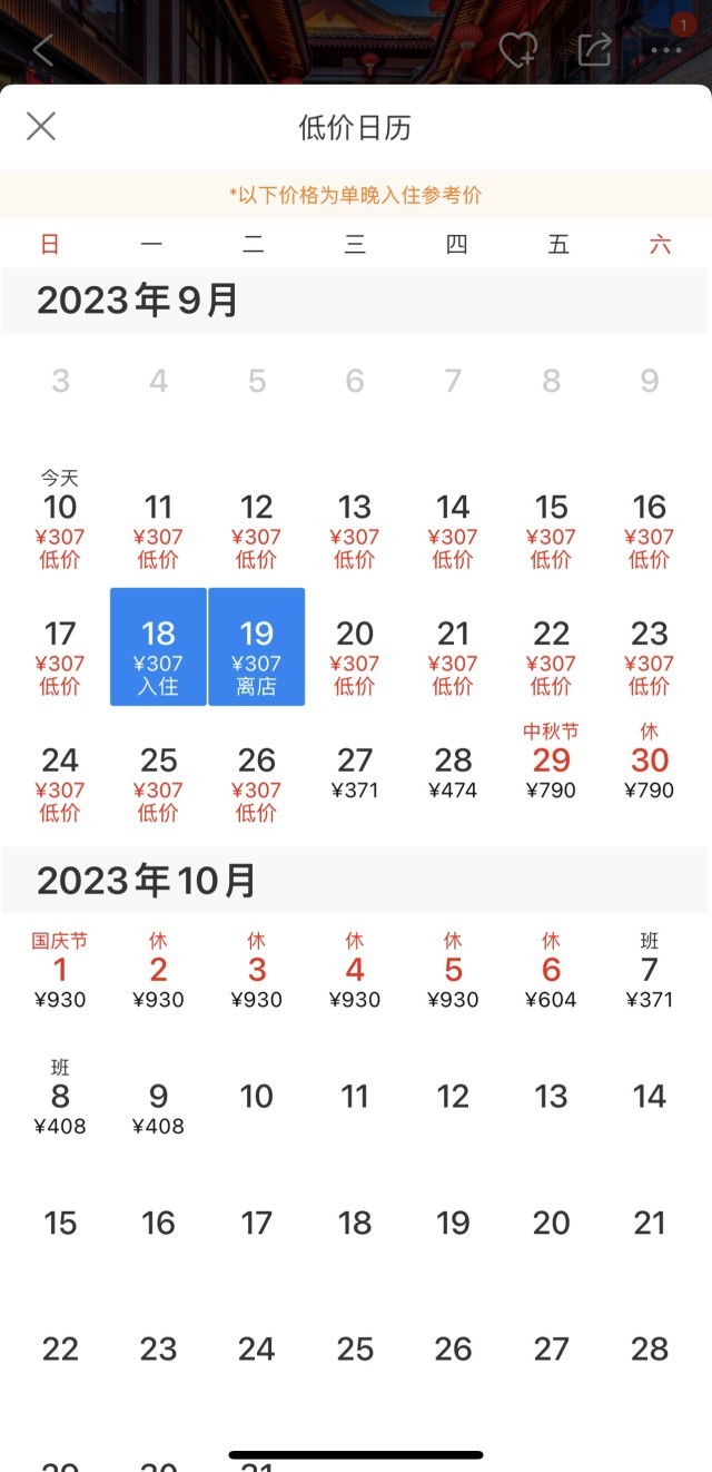 另一家距离西安大唐不夜城出入口300米以内的经济型酒店,平日最低价格仅307元/晚,而9月29日、30日入住的客房最低价格为790元,是平日价格的2.57倍;10月1日和10月2日入住的客房最低价格为930元,是平日价格的3.03倍。