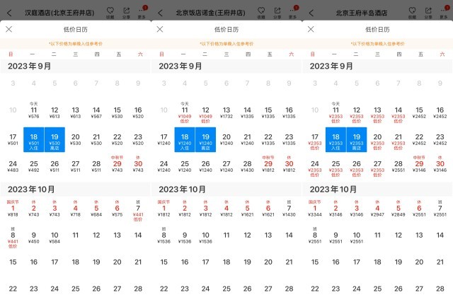 以北京王府井地区为例,如汉庭酒店北京王府井店,平日最低价格为441元/晚,10月1日入住的最低价格为818元/晚,是平日价格的1.85倍。而北京饭店诺金王府井店平日最低价格为1049元/晚,9月29日至10月4日期间入住的最低价格为1812元/晚,是平日价格的1.73倍;北京王府半岛酒店平日最低入住价格为2353元/晚,10月1日入住的最低价格为3344元/晚,是平日价格的1.42倍。