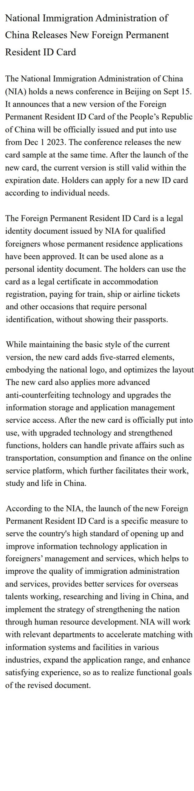 国家移民管理局相关负责人介绍,启用新版永居证,是服务保障国家高水平对外开放,提升外国人管理服务信息化水平的实际举措,有利于提升移民管理服务的质量效率,更好服务海外人才来华工作、学习、生活,贯彻落实好人才强国战略。下一步,国家移民管理局将会同有关部门加快推进各相关行业信息系统、设施设备的匹配性升级改造,拓展应用范围,提升体验满意度,全面顺利实现改版永居证的功能目标。