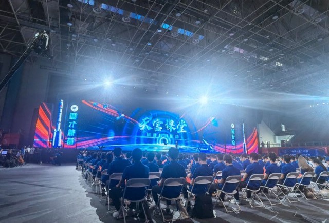 当天15时许,2400余人齐聚北京航空航天大学体育馆,参加“天宫课堂”第四课科普教育活动。这是本次授课的5个地面主课堂之一。开场前,一支乐队在体育场左侧开始演奏,优美的乐声响遍整个会场。