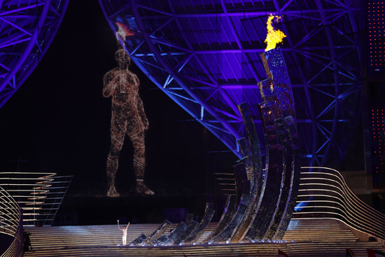 凝聚着亿万亚洲人民热情的数字火炬手来到场内,由19根形态各异的立柱排列组合而成的“钱江潮涌”主火炬塔缓缓抬起。在中央的185米长的立体网幕上,数字火炬手举起手中的火炬和今晚的最后一棒火炬手汪顺一起,点燃了杭州亚运会主火炬。