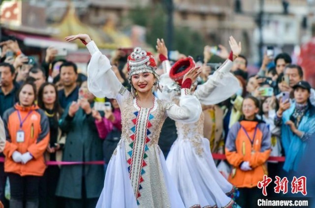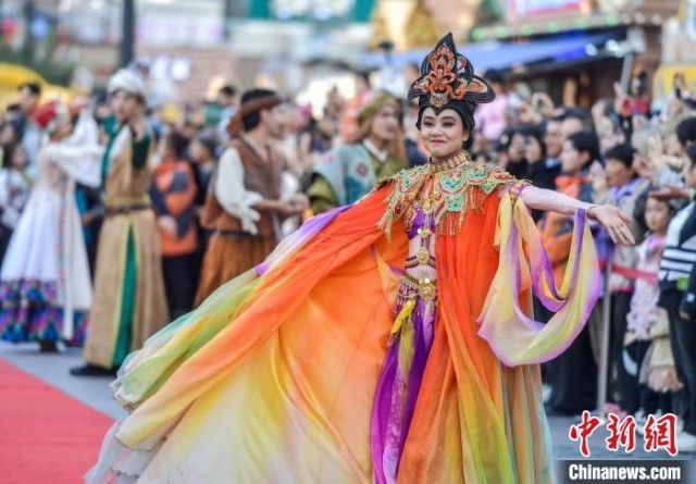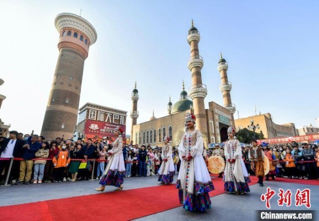 9月29日,位于新疆乌鲁木齐市二道桥的新疆国际大巴扎举行开街仪式,吸引众多市民及游客围观。即日起,该景区每天将举办隆重盛大的开街仪式,充满民族特色的音乐和舞蹈,以及时装走秀、巡游等环节,让游客近距离感受新疆的“热情”。