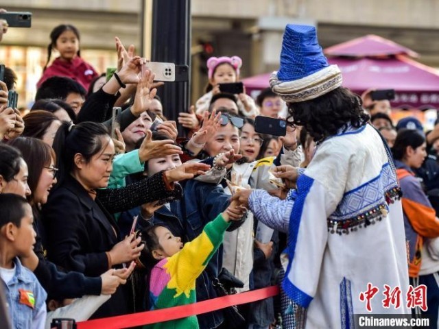 演员为游客互动,分发糖果。中新网记者 刘新 摄
