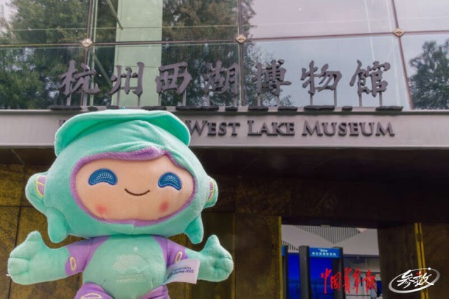 杭州亚运会吉祥物“莲莲”与杭州西湖博物馆。 实习生 汪苗/摄