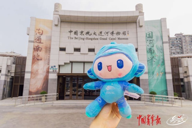 杭州亚运会吉祥物“宸宸”与中国京杭大运河博物馆。 实习生 汪苗/摄