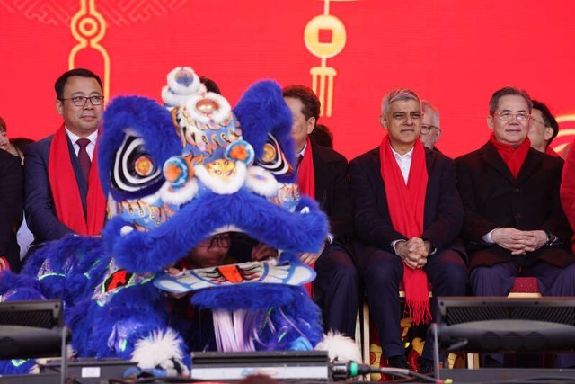 2月11日,英国伦敦,伦敦市长萨迪克·汗(右二)、中国驻英国大使郑泽光(右一)在特拉法加广场参加农历新年庆祝活动。视觉中国供图
