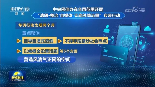 近日,中央网信办在全国范围开展“清朗·整治‘自媒体’无底线博流量”专项行动。专项行动为期两个月,重点整治自导自演式造假、不择手段蹭炒社会热点、以偏概全设置话题等5个方面,营造风清气正网络空间。