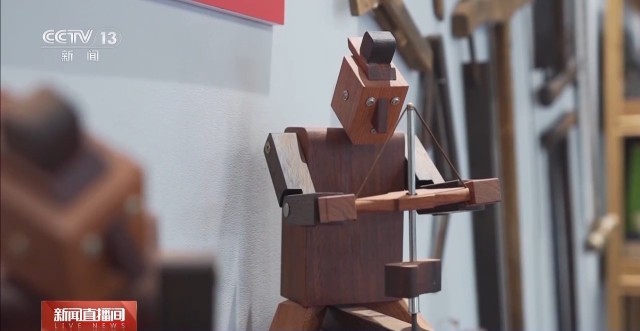 山东省非物质文化遗产“桥氏木作”技艺传承人乔一兵在工作站里也有自己的工作室,他用一整块木料、不用一钉一铆,制作鲁班枕结构的系列用品。
