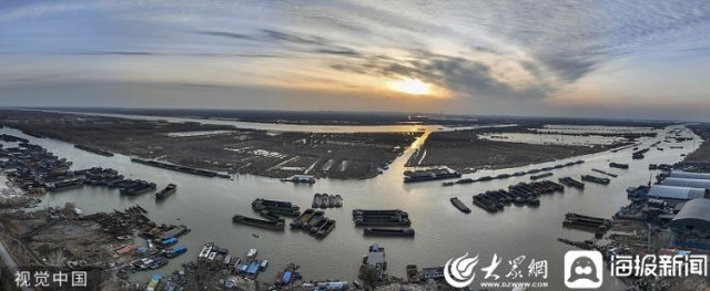 2023年2月13日,山东济宁,京杭大运河微山段货运船只穿梭往来,一派繁忙景象。来源:视觉中国
