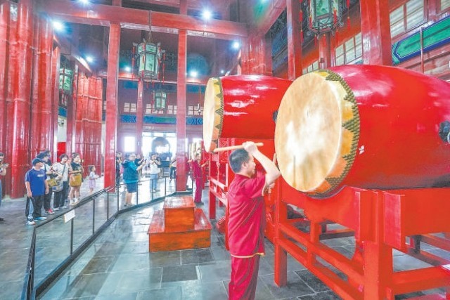 图为鼓楼上的击鼓报时表演。 本报记者 武亦彬摄