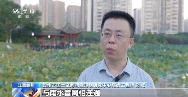 赣州市国土空间调查规划研究中心高级工程师 孙威:城市中央生态公园的水体与雨水管网相连通,就像福寿沟和各池塘相连接一样,增强了城市蓄洪排涝的功能。此外,湖区还种植了水生植物,比如说荷花、菖蒲、睡莲等,来提高公园水体水质。