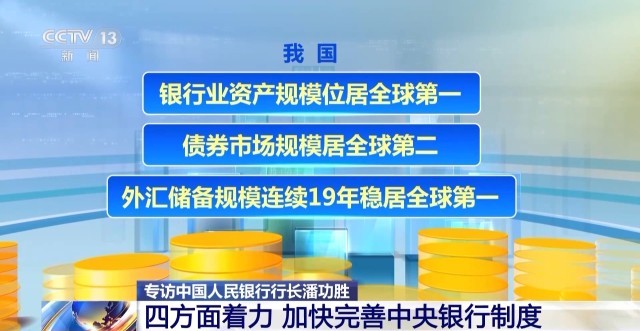 潘功胜介绍,目前,我国银行业资产规模位居全球第一;债券市场规模居全球第二;外汇储备规模连续19年稳居全球第一。数字金融、绿色金融、普惠金融走在世界前列。人民币在国际货币基金组织特别提款权货币篮子中的权重居第三。这些都为加快完善中央银行制度奠定了良好的基础。