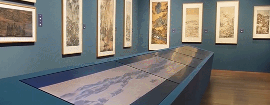 浙江大学艺术与考古图像数据实验室 陈晓皎:墙面上正好是不同朝代画家的画作,我们希望观众在浏览不同画作之后,也能够看到人工智能技术同样能够学习他们画作的特点、特征,学习了金碧山水、青绿山水,然后生成作品。