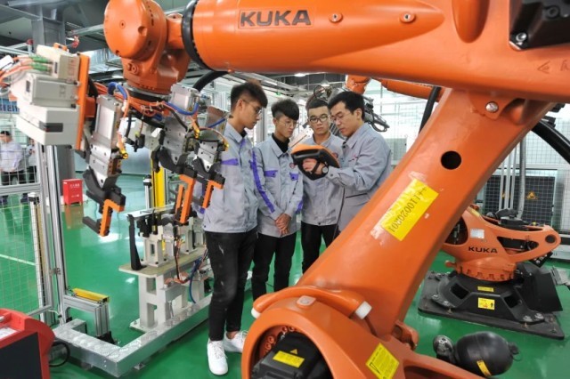 长春汽车职业技术大学学生在工业机器人技术中心参加实训。