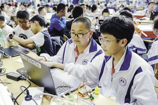 长春汽车经济技术开发区第二实验学校学生在参加中小学人工智能综合实践活动。