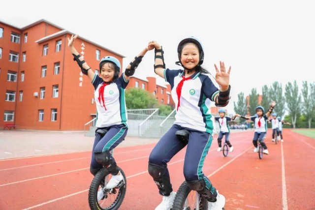 吉林省长春市绿园区同心小学学生在学校“活力操场”上骑独轮车。
