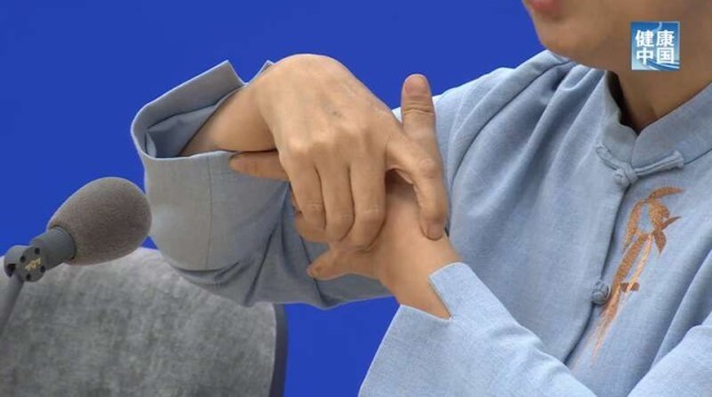 张晋在发布会上示范如何取列缺穴。图片来源:微信公众号“健康中国”
