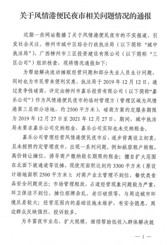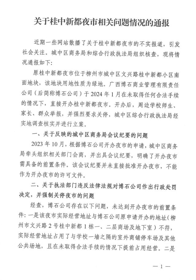 近期关于网上反映桂中新都夜市、风情港夜市关停有关问题,引发社会关注。城中区高度重视,立即组织有关部门开展核查,现将情况通报如下: