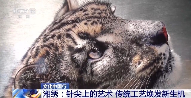 湘绣省级非遗传承人 彭娟:这幅作品就是鬅毛针的刺绣作品,当时我们在刺绣这幅作品的时候,首先打底用非常粗的线,然后慢慢过渡到边缘,就是非常精细的绣线,比头发丝细得多。一根毛发我们都要绣个十几针,才能把它完整转过来,这样一幅完整的作品绣出来要一年多的时间。