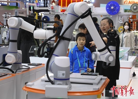 11月30日,北京,中国国际展览中心(顺义馆)链博会数字科技链展区,一位家长带着孩子在一台智能装配检测线机器人前驻足参观。当日,是第二届链博会的最后一天。11月29日-30日,是链博会的普通观众日,现场迎来大量的普通观众。中青报·中青网记者 陈剑/摄