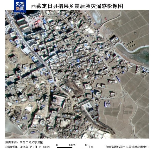 记者今天(8日)从自然资源部获悉,西藏日喀则市定日县发生6.8级地震后,国土卫星遥感应用中心提供的最新遥感影像显示,措果乡政府所在地有部分民房损毁,救援队伍已经进驻,损毁房屋附近已经搭起了应急帐篷,同时救援车队正在沿着219乡道持续进驻。