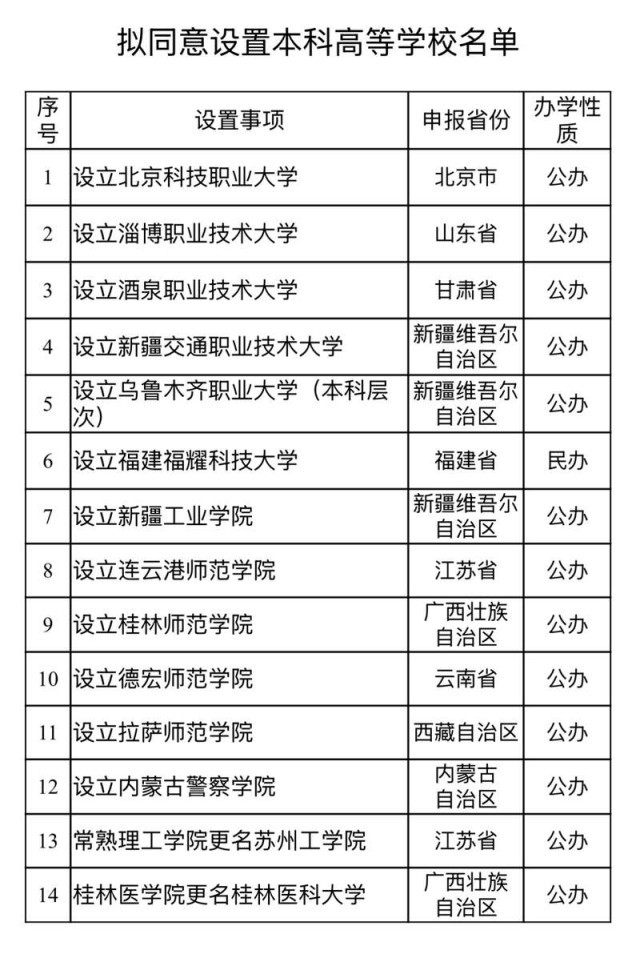 据了解,此次公示的14所本科高等学校,是根据《中华人民共和国高等教育法》《普通高等学校设置暂行条例》《普通本科学校设置暂行规定》《本科层次职业学校设置标准(试行)》等有关规定,以及第八届全国高等学校设置评议委员会考察评议结果,经教育部党组会议审议确认,公示时间为2025年1月13日至1月17日。