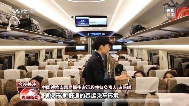 中国铁路南昌局福州客运段整备负责人 雍晨曦:今年春运,客流高峰日预计出现在正月初八。为此,我们准备了25万余件高温熨烫消毒卧具和头靠巾,增配了23万余件满足旅途需求的卫生纸等消耗品,确保干净、舒适的春运乘车环境。