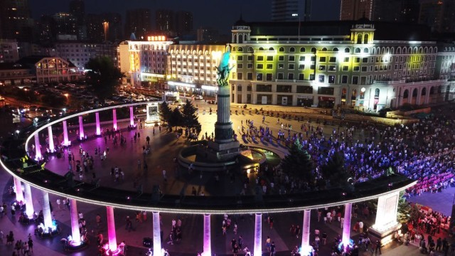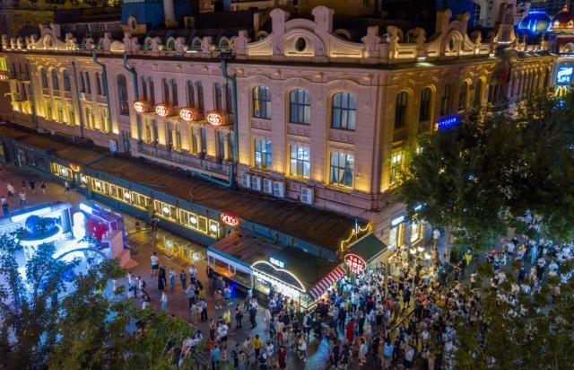 2024年8月14日,人们在百年老街中央大街上的马迭尔冷饮厅购买特色食品(无人机照片)。