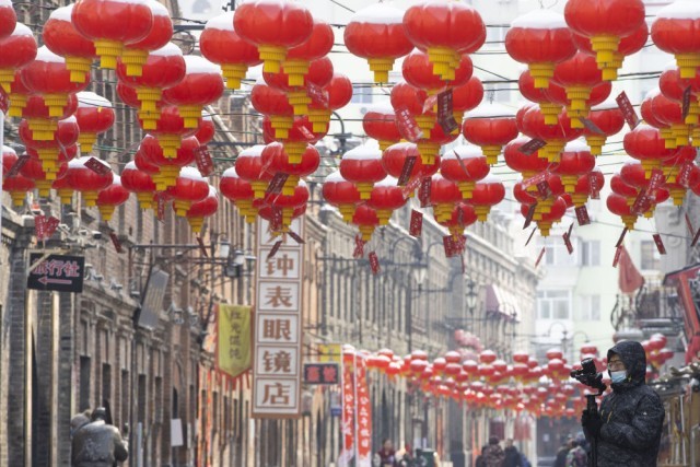 2022年2月15日,市民在哈尔滨中华巴洛克历史文化街区游玩。