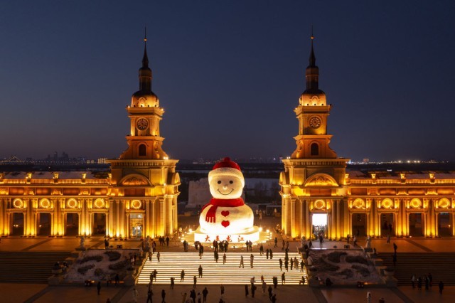 2025年1月3日,游客在哈尔滨群力音乐公园“网红大雪人”附近游玩(无人机照片)。