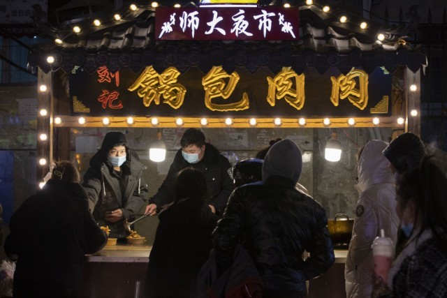 2021年3月5日,市民在哈尔滨“师大夜市”上排队购买美食。