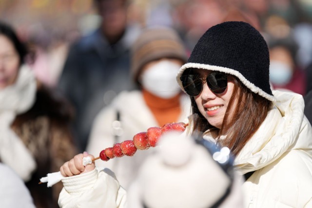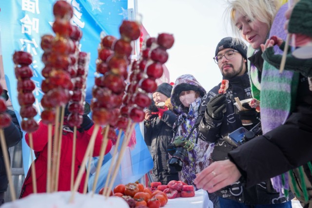2024年2月12日,游客在哈尔滨百年老街中央大街品尝草莓冰糖葫芦。