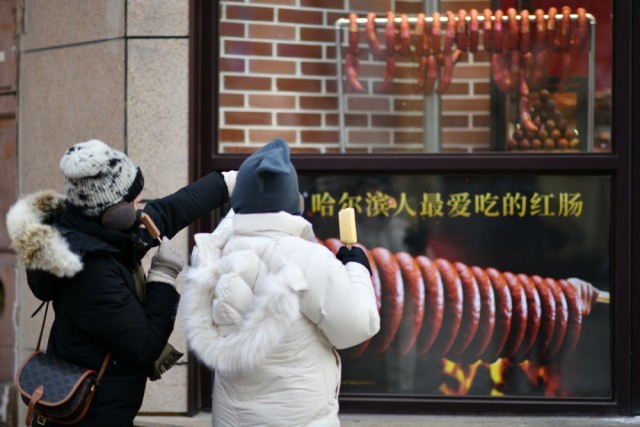 2024年1月22日,在哈尔滨中央大街,游客在一家哈尔滨红肠售卖店铺前留影。