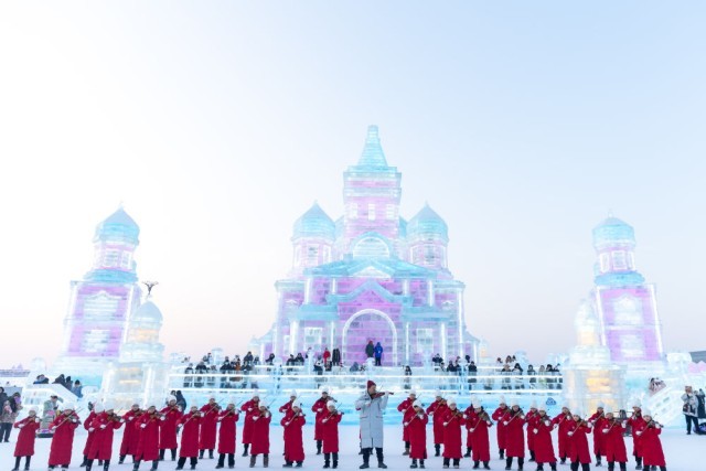 2024年1月11日,游客在哈尔滨建筑艺术广场游玩。